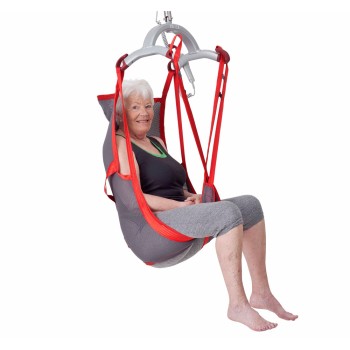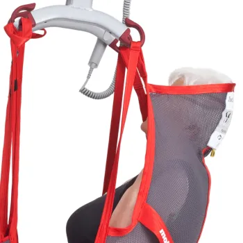 The medium-back design supports the whole body and promotes a natural sitting posture. It is suitable for users with good head control and incorporates sliding loops, leg rests and reinforced straps to improve weight distribution and comfort during hoisting.